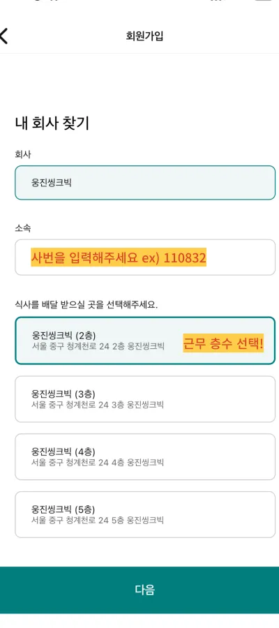 1. 회사코드’ WJTHINKBIG77 ‘ 입력 2. 소속(*사번) 및 배송지(근무지) 입력